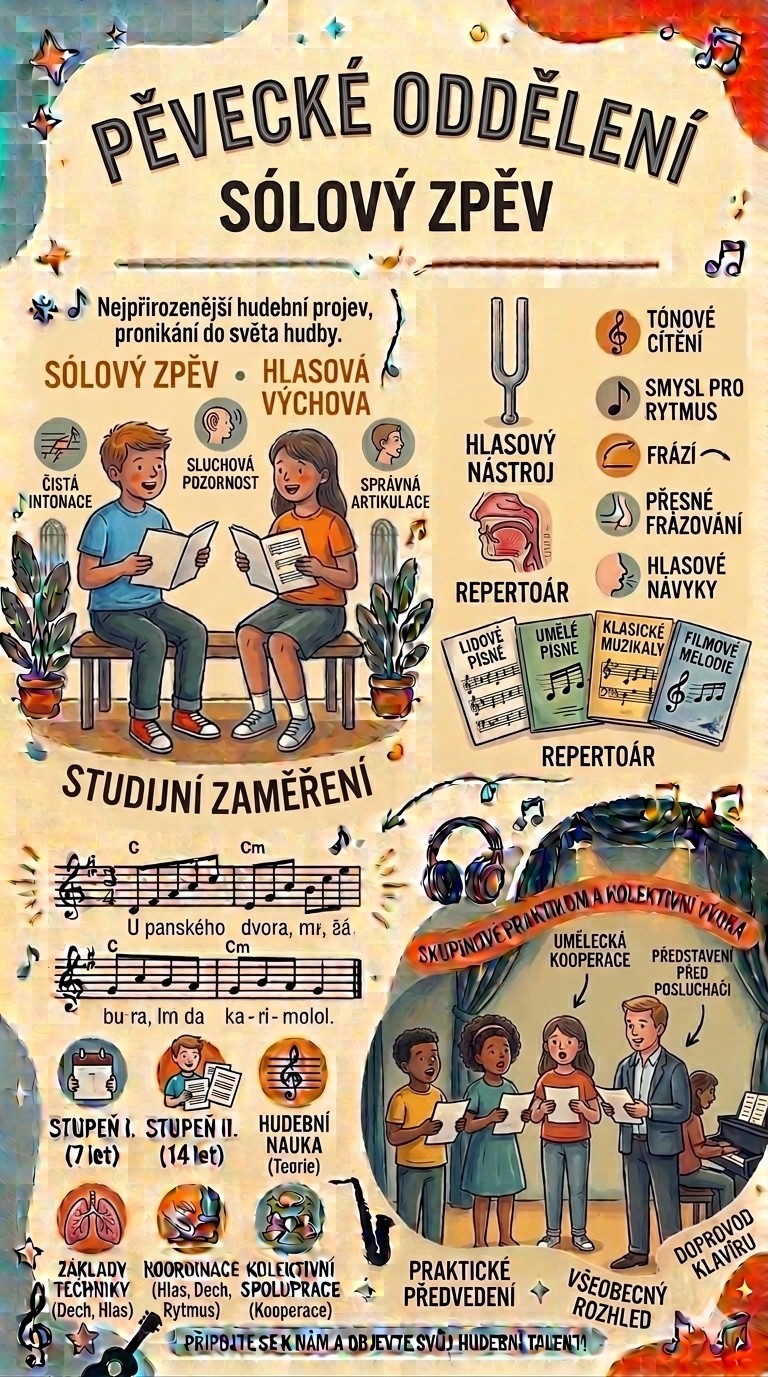 Zpěv - nejpřirozenější lidský hudební projev je nedílnou součástí doposud každé společnosti. V dnešní době, která je typická pro svou multižánrovostí artificiální i nonartificiální hudby, nabízí obor pěvecká hlasová výchova a zpěv možnost i nejmladším generacím pronikat do světa hudby, objevovat krásu přirozeně vedeného, vyrovnaného, správně artikulovaného a na dechu posazeného lidského hlasu. Obor dále pěstuje čistou intonaci, sluchovou pozornost, smysl pro rytmus, melodii a frázi. Zaměřuje se na zvládnutí interpretace lidových písní v jednoduchých i náročnějších klavírních úpravách, umělých písní, písní z klasických světových muzikálů i filmů. Soustavně se zabývá kultivací žáka po stránce hlasových návyků, přednesu i všeobecného rozhledu v oblasti hudebního oboru. Cíleně rozvíjí schopnost umělecké kooperace se spolužáky jiných oborů, a to i v praktickém předvedení před posluchači.